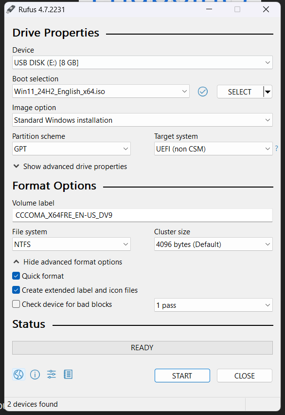 - Hoàn tất: Khi quá trình hoàn tất, thanh tiến trình sẽ chuyển sang màu xanh lá cây và nút "START" sẽ chuyển thành "READY".